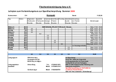 Die Fischereivereinigung Isny e.V. bietet ab 20. Mai 2026 einen Lehrgang zum Erwerb der Sachkunde für den Fischereischein an. Der Kurs ist als Abendkurs mit 38 Stunden konzipiert (inkl. Praxisteilen an Samstagen). Die Fächer Allgemeine und Spezielle Fischkunde, Geräte-, Gewässer- und Gesetzeskunde sowie einer praktischen Unterweisung vermitteln die Lehrgangsleiter Simon Barg und der ebenfalls sehr erfahrene Ausbilder Gerhard Jäger.